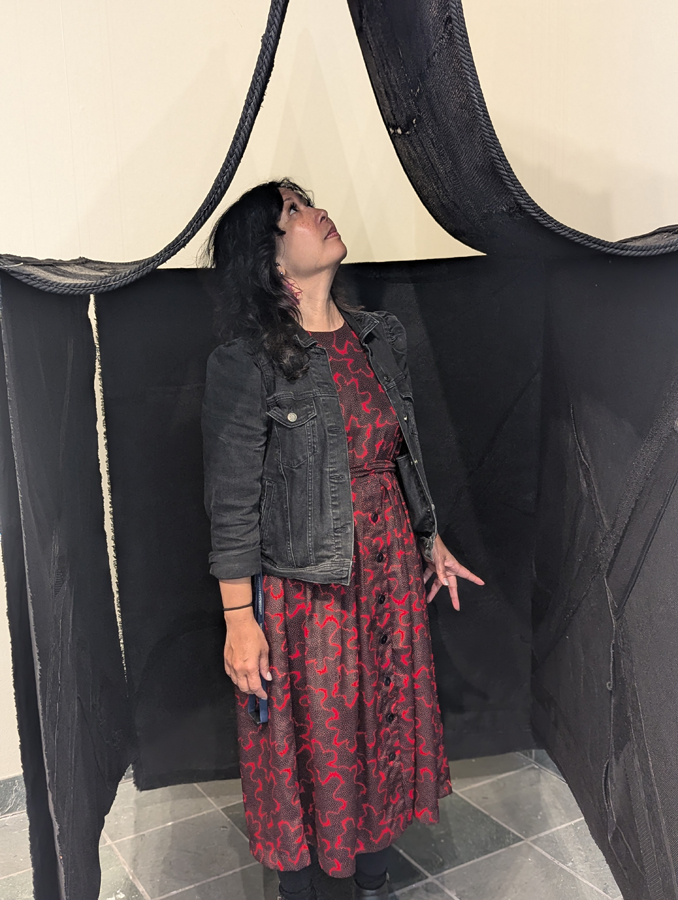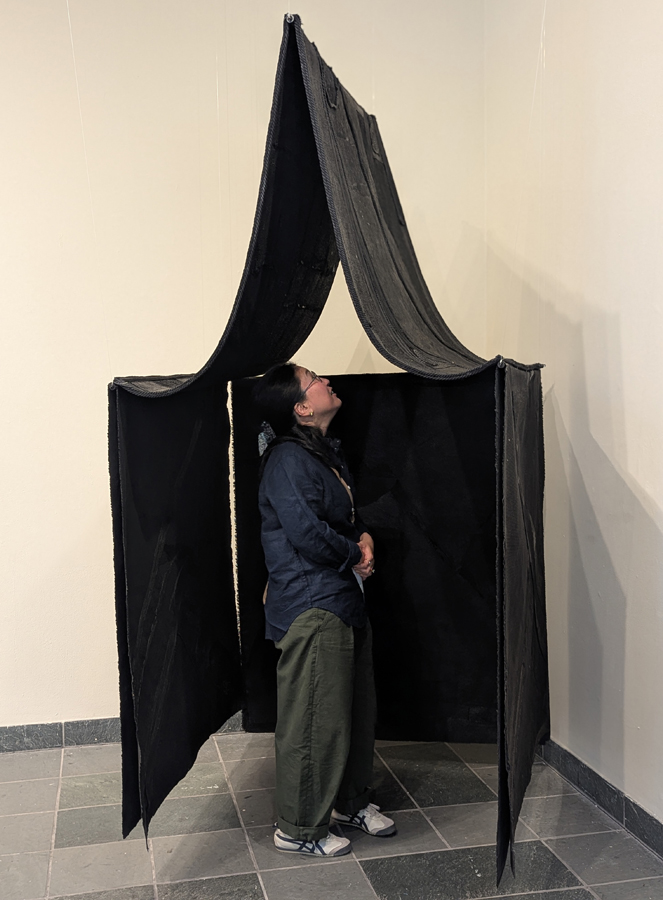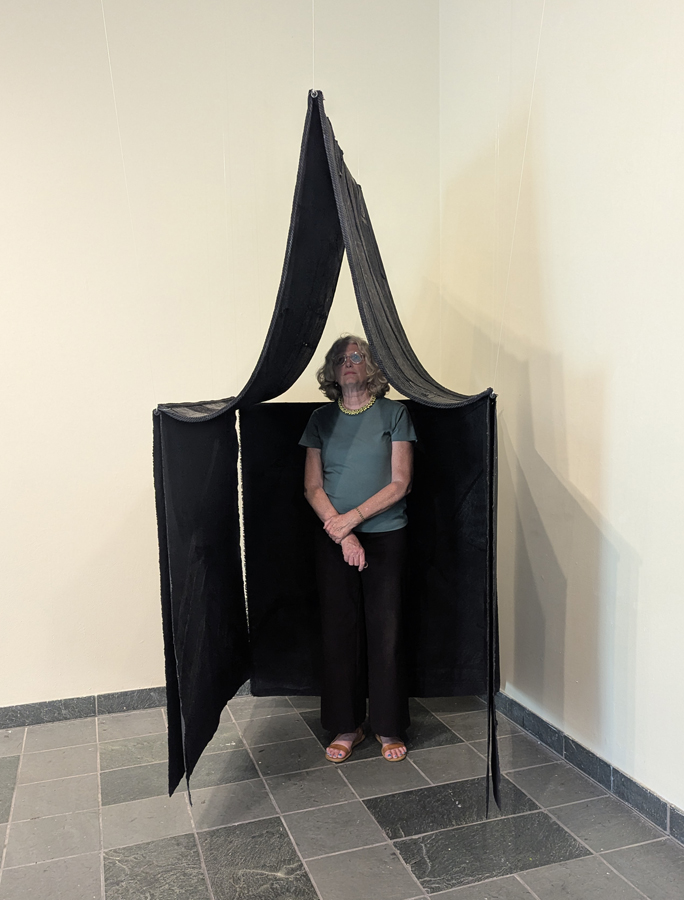The production team, Curt Neill and Jonny Solomon did a great job, and the process took much less time than we anticipated. Jonny had some strong and solid shower curtain rods he brought from his previous home, and they worked beautifully as extensions of the hanging mechanism into the open space between the gates, creating an entry way that altered the space yet allowed for comfortable ingress and egress. We secured the bottoms of the panels loosely so that they wouldn’t blow around, yet stitchers could reach in-between two sides of the panels to pull their needles through.