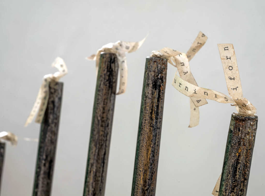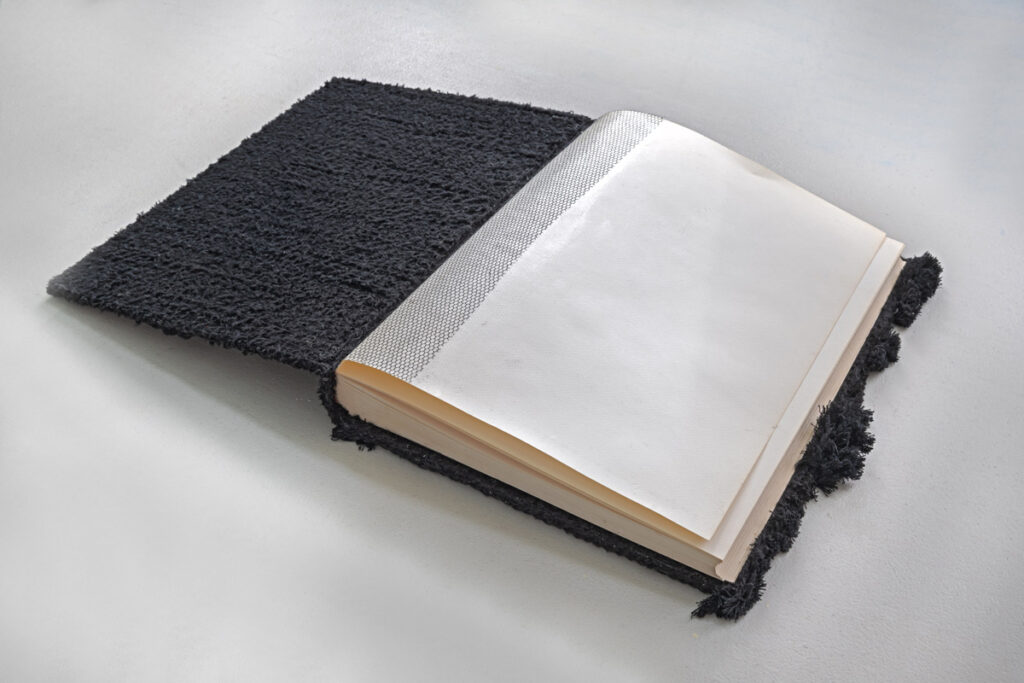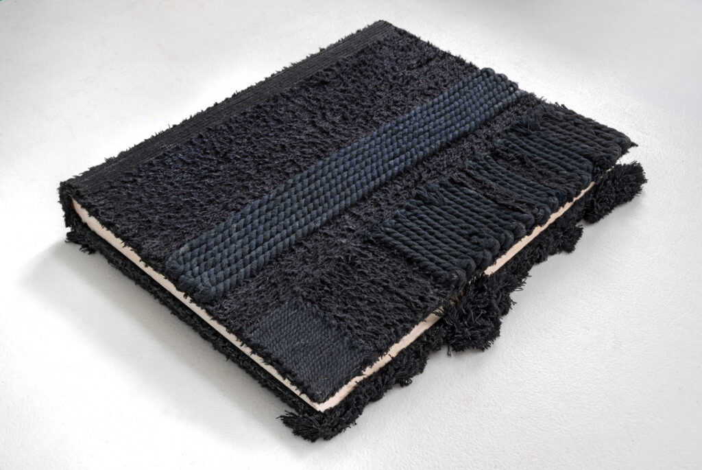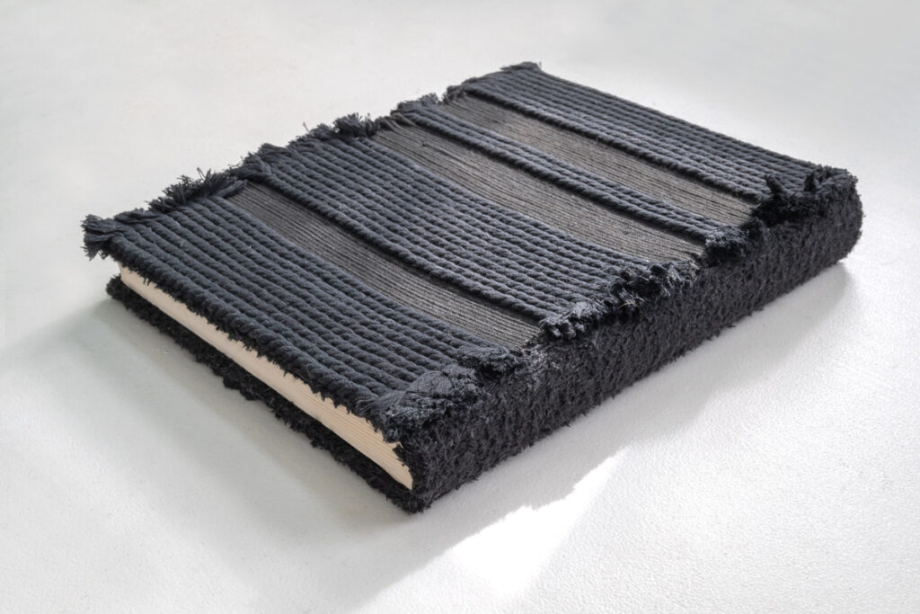 CURRENT Communion, 2025, 10.5 x 21.5 x 8.5" (dimensions variable), wood, hemp/assorted cord, acrylic paint Communion, 2025, 10.5 x 21.5 x 8.5" (dimensions variable), wood, hemp/assorted cord, acrylic paint Communion, 2025, 10.5 x 21.5 x 8.5" (dimensions variable), wood, hemp/assorted cord, acrylic paint Rapt, 2025, 29 x 13 x 13", wood, jute cord The Six Stages of Knowing, 2025, 7.5 x 52 x 9", canvas, fabric, hemp cord, acrylic paint, wax The Six Stages of Knowing, 2025, 7.5 x 52 x 9", canvas, fabric, hemp cord, acrylic paint, wax The Six Stages of Knowing, 2025, 7.5 x 52 x 9", canvas, fabric, hemp cord, acrylic paint, wax SpeakEasy Chair, -2025, 36 x 17.5 x 17", wood chair, typewriter / eraser tape, acrylic paint, varnish SpeakEasy Chair, (detail), -2025, 36 x 17.5 x 17", wood chair, typewriter / eraser tape, acrylic paint, varnish SpeakEasy Chair, (detail), -2025, 36 x 17.5 x 17", wood chair, typewriter / eraser tape, acrylic paint, varnish Black Book (front cover), 2025, 15 x 13 x 2", repurposed album (paper, board, book cloth), assorted cord/yarn, netting Black Book (interior), 2025, 15 x 13 x 2", repurposed album (paper, board, book cloth), assorted cord/yarn, netting Black Book (back cover), 2025, 15 x 13 x 2", repurposed album (paper, board, book cloth), assorted cord/yarn, netting The Body Politic: Like White on White, 2024, 9 x 16 x 7", book board, paint, canvas, hemp/assorted cord, trim The Body Politic: Like White on White, 2024, 9 x 16 x 7", book board, paint, canvas, hemp/assorted cord, trim The Body Politic: Like White on White, 2024, 9 x 16 x 7", book board, paint, canvas, hemp/assorted cord, trim The Body Politic: White and...(I), 2024, 9 x 19 x 6", book board, paint, canvas, hemp / assorted cord, trim The Body Politic White and...(I), 2024, 9 x 19 x 6", book board, paint, canvas, hemp / assorted cord, trim The Body Politic White and...(I), 2024, 9 x 19 x 6", book board, paint, canvas, hemp / assorted cord, trim The Body Politic White And...(II), 2024, 9 x 16 x 6", book board, paint, canvas, hemp / assorted cord, trim The Body Politic: White and...(II), 2024, 9 x 16 x 6", book board, paint, canvas, hemp / assorted cord The Body Politic: White and...(II), 2024, 9 x 16 x 6", book board, paint, canvas, hemp / assorted cord The Body Politic: Black and Gold, 2024, 8.5 x 23 x 7", bk board, paint, canvas, metal leaf, lace, cord, netting, trim, beads The Body Politic: Black and Gold, 2024, 8.5 x 23 x 7", bk board, paint, canvas, metal leaf, lace, cord, netting, trim, beads The Body Politic: Black and Gold, 2024, 8.5 x 23 x 7", bk board, paint, canvas, metal leaf, lace, cord, netting, trim, beads White Wedding, 2023, 15 x 21.5 x 10.75", book board, canvas, muslin, watercolor paper, hemp cord, string, linen thread White Wedding, 2023, 15 x 21.5 x 10.75", book board, canvas, muslin, watercolor paper, hemp cord, string, linen thread Forest Through The Trees, 2021, 15 x 42 x 12", book board, hemp cord, lace, used typewriter ribbon, wood, canvas, paint Forest Through The Trees, 2021, 15 x 42 x 12", book board, hemp cord, lace, used typewriter ribbon, wood, canvas, paint Forest Through The Trees, 2021, 15 x 42 x 12", book board, hemp cord, lace, used typewriter ribbon, wood, canvas, paint It's Not Black and White, 2021, 9 x 22 x 7.5", book board, canvas, paper, typewriter ribbon, hemp cord It's Not Black and White, 2021, 9 x 22 x 7.5", book board, canvas, paper, typewriter ribbon, hemp cord It's Not Black and White, 2021, 9 x 22 x 7.5", book board, canvas, paper, typewriter ribbon, hemp cord Excavation of the Interior, 2021, 12 x 28 x 12.5", wood, paper, cloth, hemp cord, linen thread Excavation of the Interior, 2021, 12 x 28 x 12.5", wood, paper, cloth, hemp cord, linen thread Excavation of the Interior, (detail), 2021, 12 x 28 x 12.5", wood, paper, cloth, hemp cord, linen thread Excavation of the Interior, 2021, 12 x 28 x 12.5", wood, paper, cloth, hemp cord, linen thread Red Notebook (Here's To The Red, White and Blue), 2021, 8.5 x 12.5 x 6.5", placemat, linen thread, hemp cord, cloth, wood Red Notebook (Here's To The Red, White and Blue), 2021, 8.5 x 12.5 x 6 .5", placemat, linen thread, hemp cord, cloth, wood Red Notebook (Here's To The Red, White and Blue), 2021, 8.5 x 12.5 x 6.5",placemat, linen thread, hemp cord, cloth, wood Red Notebook (Here's To The Red, White + Blue), 2021, 8.5 x 12.5 x 6.5", placemat, linen thread, hemp cord, cloth, wood Into The Bush, (exterior), 2020, 11 x 19 x 7 ″, book board, canvas, sewing thread, acrylic paint Into The Bush, (interior), 2020, 11 x 19 x 7 ″, book board, canvas, sewing thread, acrylic paint Into The Bush, (exterior), 2020, 11 x 19 x 7 ″, book board, canvas, sewing thread, acrylic paint Torrent and Tangle: Keep Your House In Order, 2019, 10.5 x 25 x 18”, book board, hemp cord, paper, paint, lace, ribbon Torrent and Tangle: Keep Your House In Order, 2019, 10.5 x 25 x 18”, book board, hemp cord, paper, paint, lace, ribbon Torrent and Tangle: Keep Your House In Order, 2019, 10.5 x 25 x 18”, book board, hemp cord, paper, paint, lace, ribbon Ellipse, (exterior/interior), 2019, 14 x 12 x 11”, paperboard, paper, canvas, paint and cordd Ellipse, (exterior/interior), 2019, 14 x 12 x 11”, paperboard, paper, canvas, paint and cord Ellipse, (exterior), 2019, 14 x 12 x 11”, paperboard, paper, canvas, paint and cord The Gates, (interior), 2019, 7.5 x 20 x 10.25", book board, canvas, cheese cloth, jute cord, string The Gates, (interior detail), 2019, 7.5 x 20 x 10.25", book board, canvas, cheese cloth, jute cord, string The Gates, (exterior), 2019, 7.5 x 20 x 10.25", book board, canvas, cheese cloth, jute cord, string Falling, (exterior), 2019, 7 x 24.5 x 10.5", book board, paper, jute cord Falling, (interior), 2019, 7 x 24.5 x 10.5", book board, paper, jute cord Falling, (exterior), 2019, 7 x 24.5 x 10.5", book board, paper, jute cord Before the Fall, (interior-exterior), 2018, 11 x (up to) 23 x 7.5", book board, paper, canvas, jute c